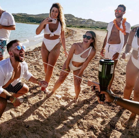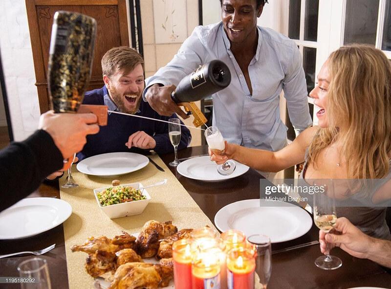 The adjustable system snaps onto any champagne bottle for immediate fun