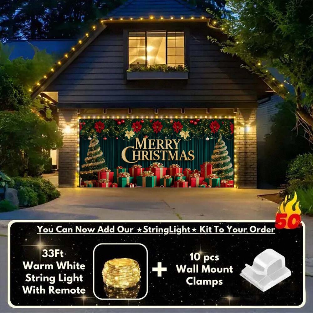 Now you can elevate your holiday display with our string light kit-available at 50% off! Pair your Christmas Garage Door Cover with glowing outdoor Christmas lights and turn your garage into a true showstopper. The kit includes 1x 33 ft warm white string light, a remote control, and 10x sticky wall mount clamps.
