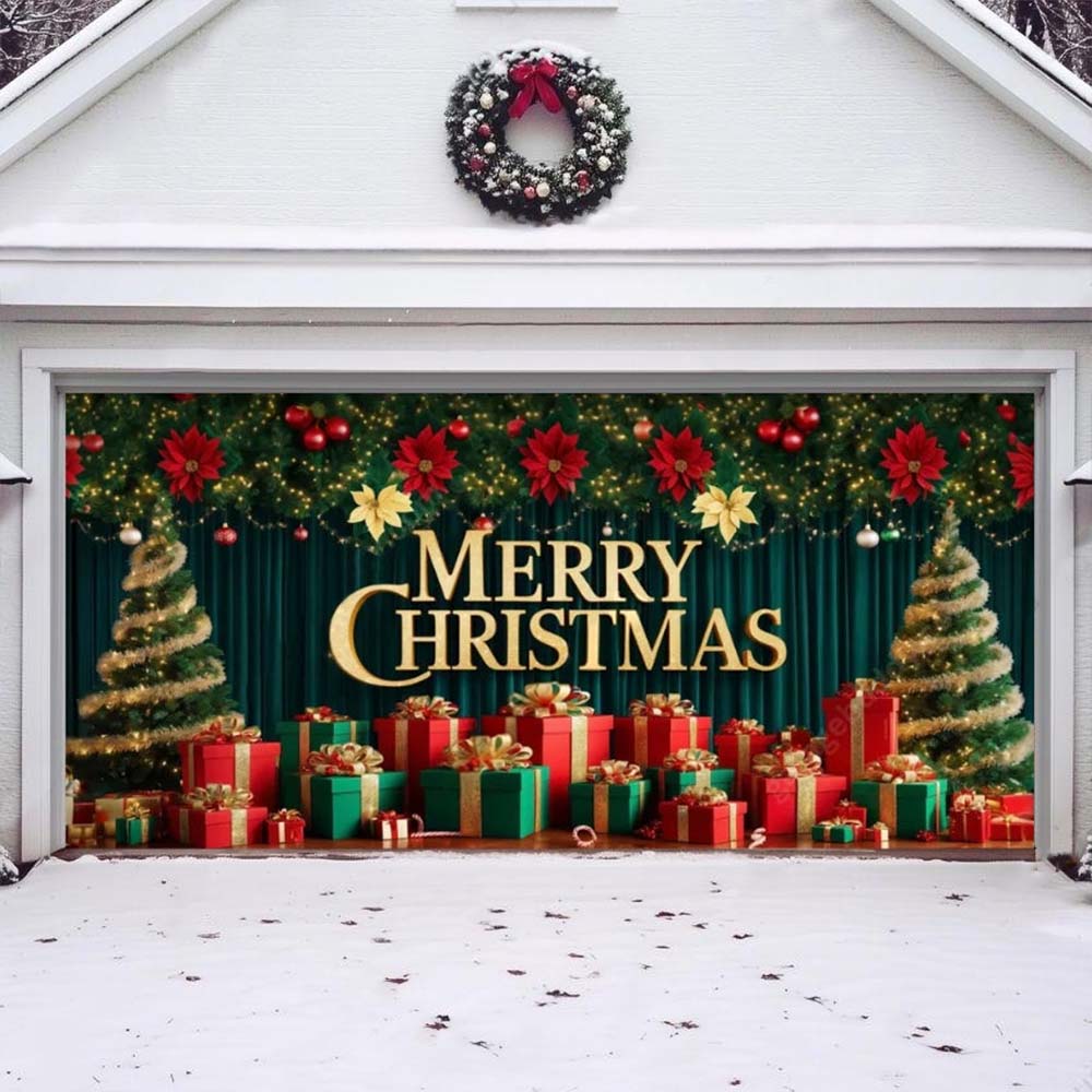 Bring a pop of festive color to your home with our striking Christmas garage door cover, featuring gifts ornaments against a cheerful holiday-green background. The elegant "Merry Christmas" greeting adds a heartfelt touch, turning your garage into a warm and welcoming focal point for the season. lt's one of those timeless holiday garage door cover ideas that instantly transforms your home exterior into something magical.