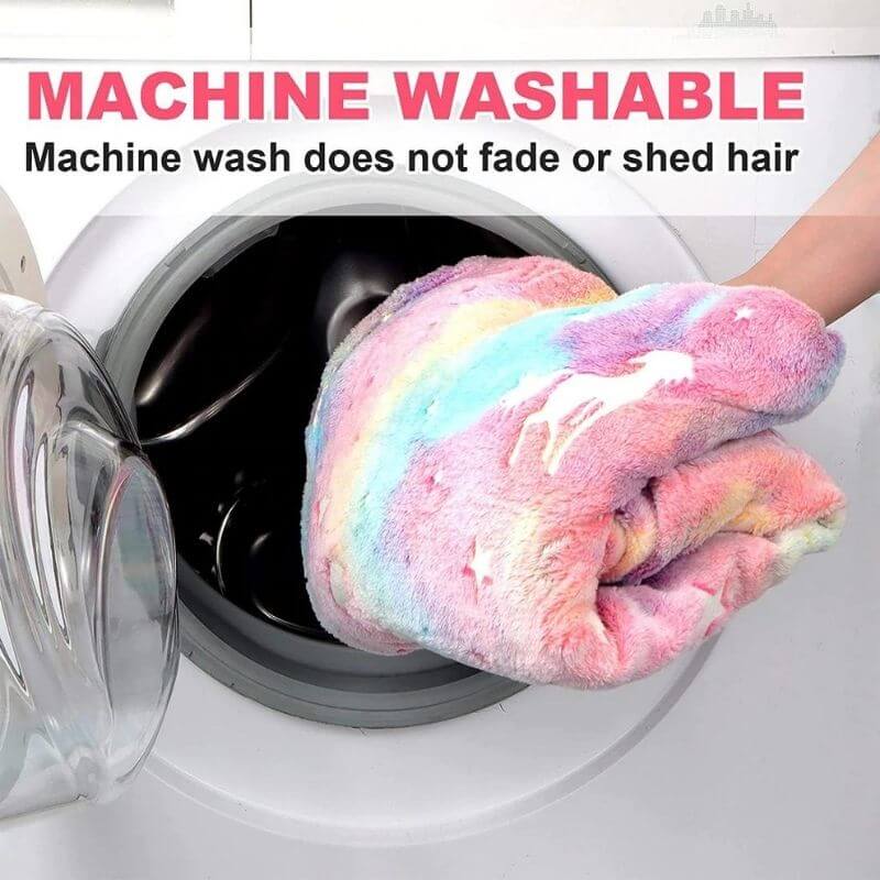☆Glow In The Dark: Our pink unicorn blanket can shine in the dark, mysterious, and interesting. Just expose it to a bright light source or sunlight for about ten minutes. The brighter the light, the stronger the blanket will be in the dark. Create a beautiful atmosphere for your bedroom.