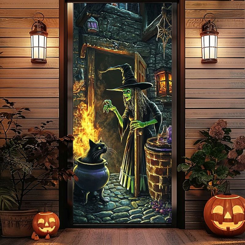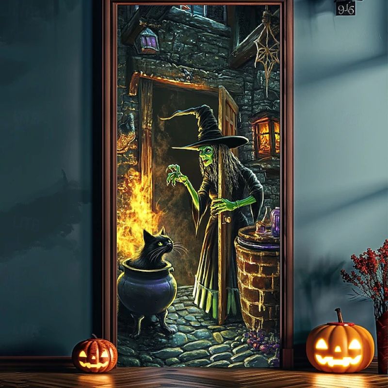 Keywords: Halloween door cover, witch door decoration, front door Halloween banner, outdoor Halloween decor, farmhouse Halloween door curtain, durable Halloween tapestry.