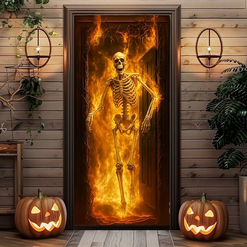 Fiery Skeleton Halloween Door Cover - Perfect for Front Door Decoration