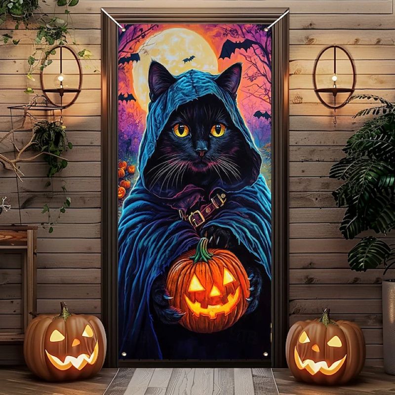 Mysterious Black Cat Halloween Door Cover - Perfect for Front Door Decoration