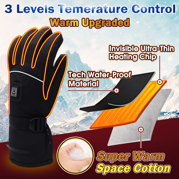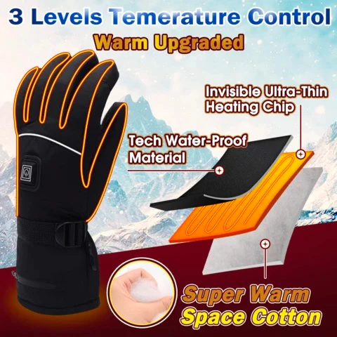 Electric Heating Gloves with Four Layers Special Design: Waterproof Coating Fabric+Extra Heavy Cotton+Invisibility Heat Chip+Reinforced PU leather. 80% cotton+20%sponge Upgraded Lining makes the thermal heated gloves differs from Any Other Rechargeable Heated Gloves.