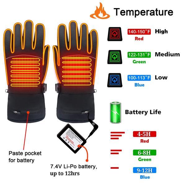 Powered with Rechargeable 7.4V Li-ion Batteries, Equipped with three different heat settings - high, middle, low, the temperature Can up to 150 Fahrenheit with the highest setting.Customized with 3 Heating Levels for Different Peoples�Needs---Red/Green/Blue, this Kind of Heated Gloves can Not Only Offer Cozy Temperature with Long Lasting Using Hours, But Also Better Griping Experience. You can feel obviously your hands warmer when turning on the gloves in 30 seconds.