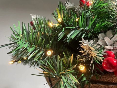 - BUILT-IN LIGHTING: Trimmed with red berries, pine cones, snow and Battery-operated UL white LED lights.