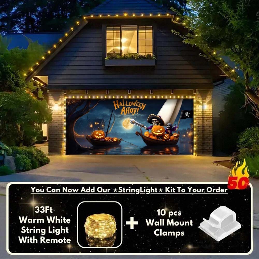 Climb aboard the creepiest ship on the seas! With pirate skeletons, glowing jack-o’-lanterns, and a full moon backdrop, the Pumpkin Pirates Halloween Garage Door Cover brings a haunted adventure right to your doorstep. Perfect for anyone searching for bold Halloween garage decoration ideas, this design instantly transforms your house into a spooky landmark that neighbors won’t forget.