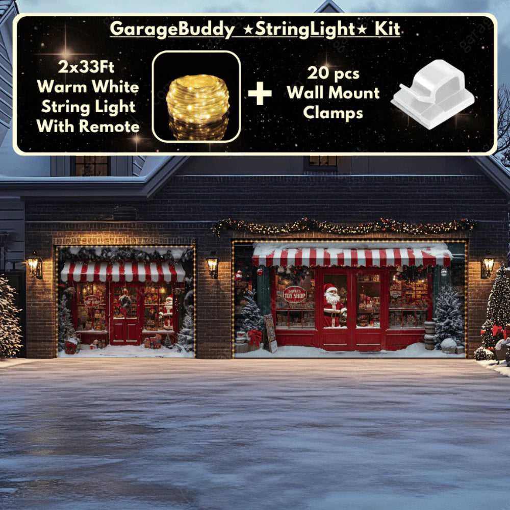 Now you can elevate your holiday display with our string light kit-available at 50% off! Pair your Christmas Garage Door Cover with glowing outdoor Christmas lights and turn your garage into a true showstopper. The kit includes 1x 33 ft warm white string light, a remote control, and 10x sticky wall mount clamps.