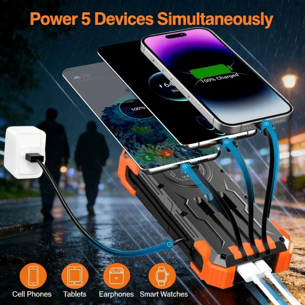 This solar charger is also equipped with 4 ports (iOS input, USB A output, USB C input/output), providing 5V/3A high-speed charging to save time. Along with 4 charging cables and wireless charging, it supports charging 5 devices simultaneously. Keep all your devices alive. Sharing with families and friends is perfect.
