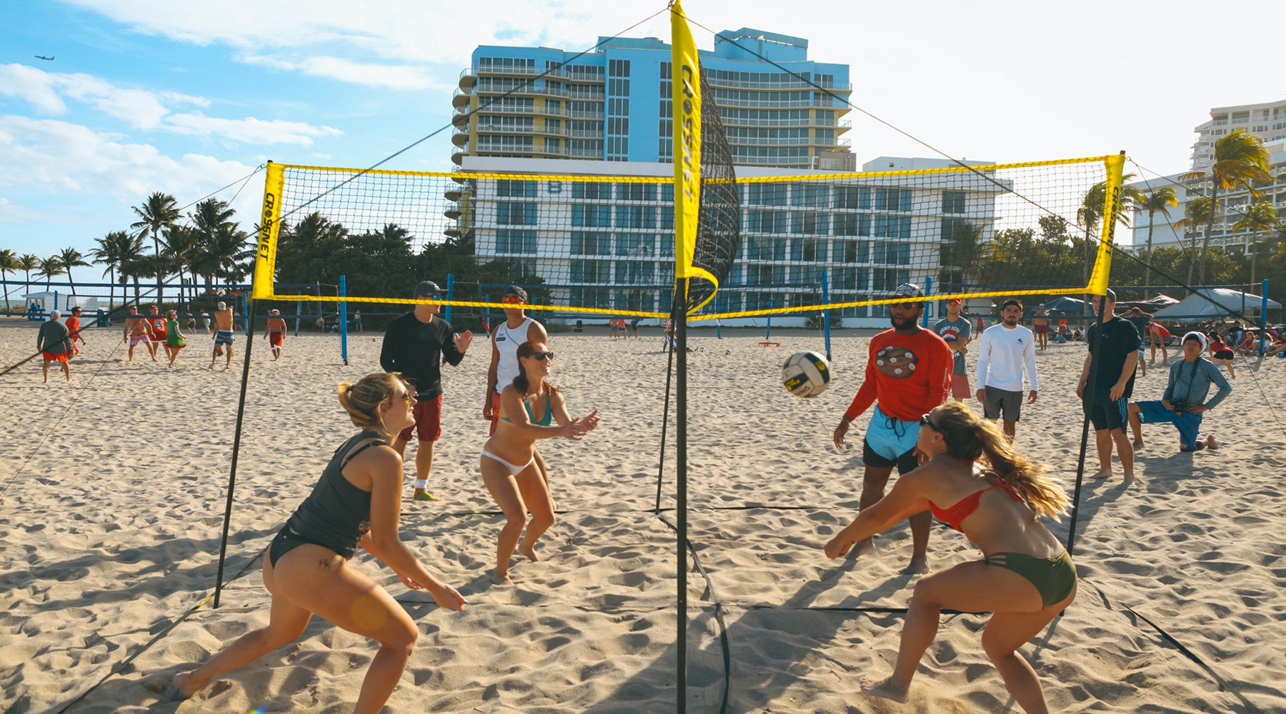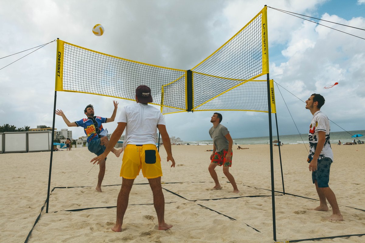 This is the world's first four square volleyball game. Set up within minutes in sand, grass, or indoors and challenge your friends to a competitive game to 11, win by 2.